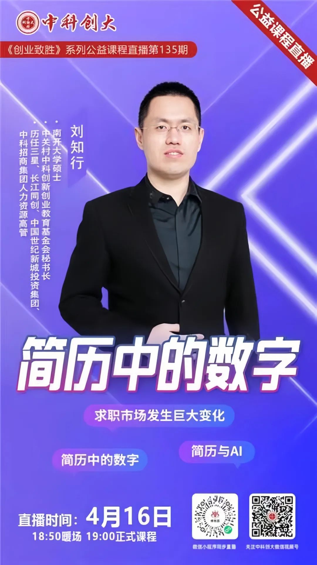 第135期《创业致胜》线上公益课程,将于2024年4月16日晚上7点正式开始。本次课程邀请南开大学硕士、中关村中科创新创业教育基金会秘书长、历任三星、长江同创、中国世纪新城投资集团、中科招商集团人力资源高管刘知行先生为大家直播讲解“简历中的数字”,详情请见海报,扫描二维码即可参与课程。