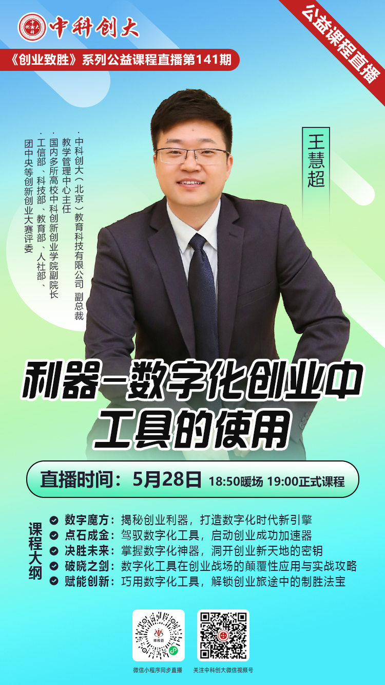 第141期《创业致胜》线上公益课程,将于2024年5月28日晚上7点正式开始。本次课程邀请中科创大副总裁王慧超先生为大家讲解“利器-数字化创业中工具的使用”,详情请见海报,扫描二维码即可参与课程。