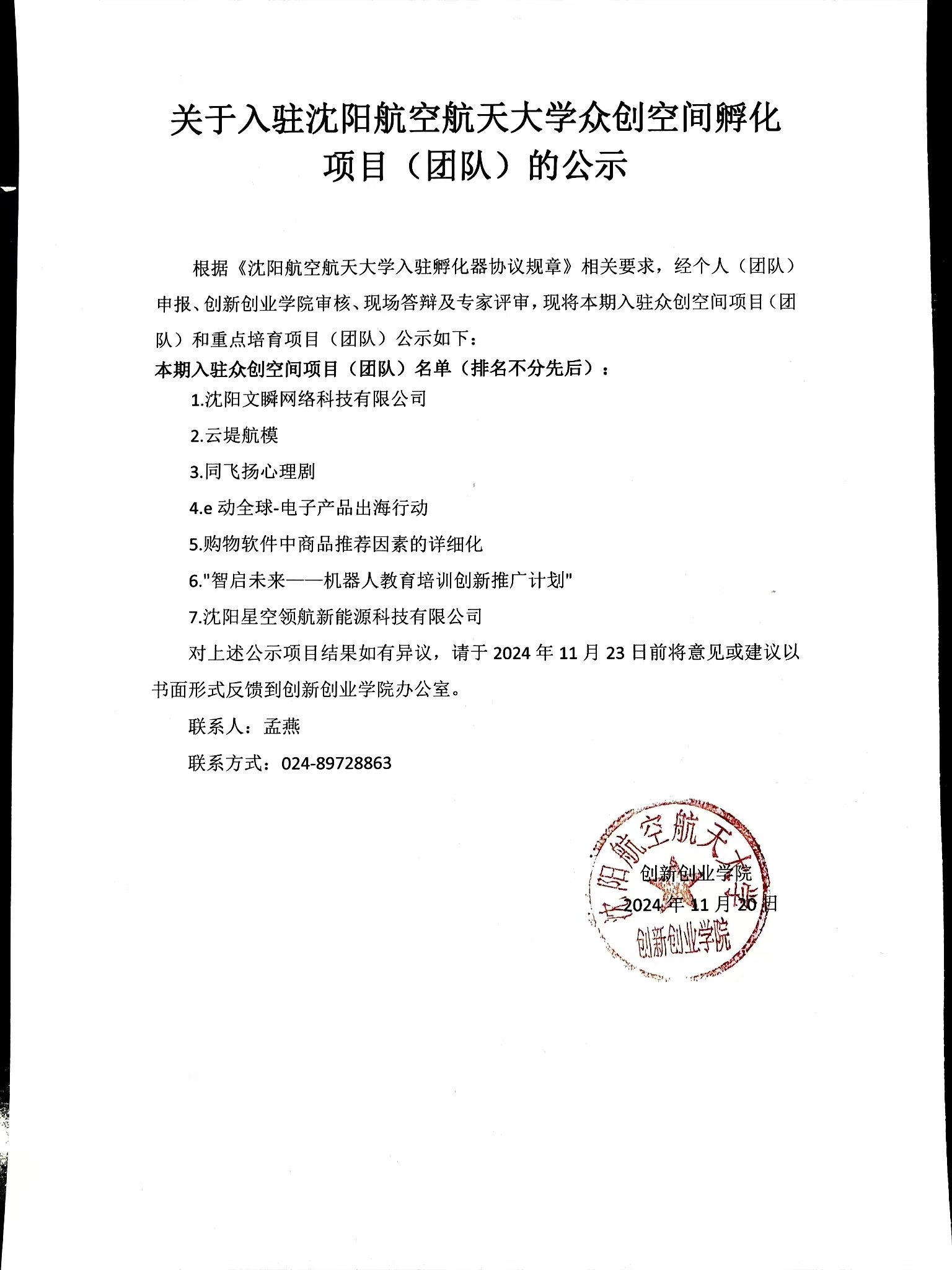 关于入驻沈阳航空航天大学众创空间孵化项目(团队)的公示