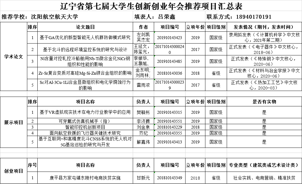 根据《辽宁省教育厅办公室关于做好第七届辽宁省大学生创新创业年会准备工作的通知》(辽教办发〔2020〕102号)的文件要求,学校从近年的省级、国家级大学生创新创业训练计划项目中遴选出学术论文项目5项、经验交流项目5项、创业推介项目1项,推荐参加第七届辽宁省大学生创新创业年会。现将项目公告如下,项目名单见附件。