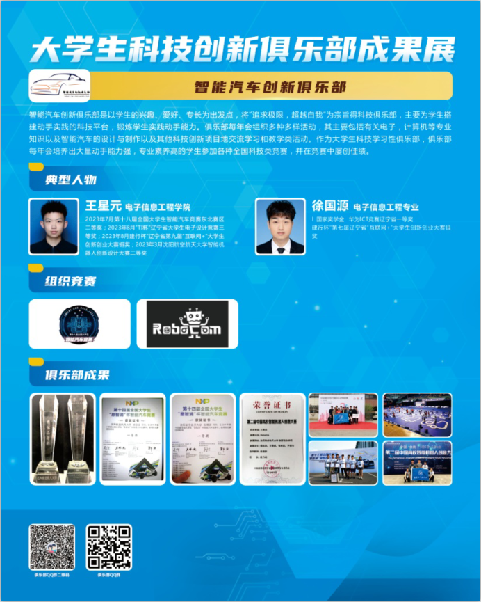 王星元,2023年7月第十八届全国大学生智能汽车竞赛东北赛区二等奖;2023年8月“TI杯”辽宁省大学生电子设计竞赛三等奖;2023年8月建行杯”辽宁省第九届“互联网+”大学生创新创业大赛铜奖;2023年3月沈阳航空航天大学智能机器人创新设计大赛二等奖