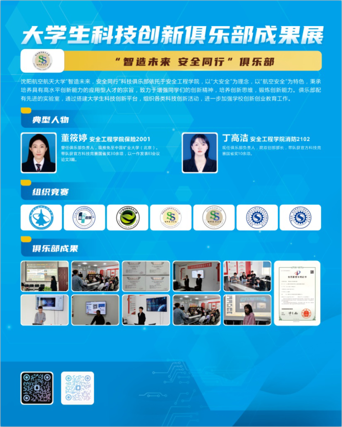 沈阳航空航天大学“智造未来,安全同行”科技俱乐部依托于安全工程学院,以“大安全”为理念,以“航空安全”为特色,秉承培养具有高水平创新能力的应用型人才的宗旨,致力于增强同学们的创新精神,培养创新思维,锻炼创新能力。俱乐部配有先进的实验室,通过搭建大学生科技创新平台,组织各类科技创新活动,进一步加强学校创新创业教育工作。