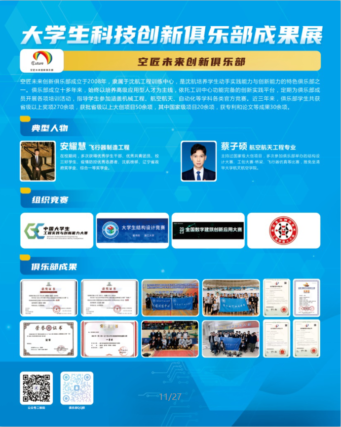 空匠未来俱乐部自2019年成立以来,在工训中心领导及创新创业学院的大力支持下,在指导教师团队以及俱乐部各成员的共同努力下,现已发展为专注培养学生动手实践能力与创新能力相结合的特色俱乐部。现有成员427人,骨干成员60多人,以参加中国大学生工程实践与创新能力大赛为主,赛后成员还将在俱乐部接受论文与专利撰写等方面的相关学术水平提升培训,俱乐部成员获得国家级奖项10余项、省级奖项90余项、校级奖项若干。