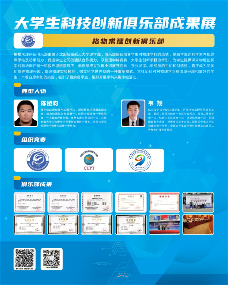 格物求理创新俱乐部隶属于沈阳航空航天大学理学院,俱乐部旨在培养学生对物理学科的热情,提高学生的科学素养和逻辑思维及动手能力,促进学生之间的团队合作能力。以物理学科竞赛、大学生创新项目为牵引,为学生提供课外物理创新实践和培训在新一轮教改思想指导下,俱乐部成立兴趣小组展开活动,充分发挥小组成员的主动和创造性,真正成为同学们培养物理兴趣,掌握物理实验技能,树立科学世界观的一种重要模式。本社团针对对物理学习有浓厚兴趣和爱好的学生,本着自愿参加的宗旨,吸引了百余名学生,组织开展学科兴趣小组活动。
