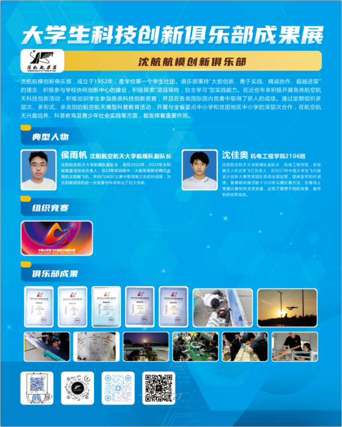 沈航航模创新俱乐部,成立于1952年,是学校第一个学生社团。俱乐部秉持“大胆创新、勇于实践、精诚协作、超越进取”的理念,积极参与学校协同创新中心的建设,积极探索“项目导向,自主学习”型实践能力。在近些年来积极开展各类航空航天科技创新活动,积极组织学生参加各类科技创新竞赛,并且在各类国际国内竞赛中取得了骄人的成绩。通过定期组织多层次、多形式、多类别的航空航天模型科普教育活动,开展与全省重点中小学和贫困地区中小学的深层次合作,在航空航天兴趣培养、科普教育及青少年社会实践等方面,都发挥着重要作用。